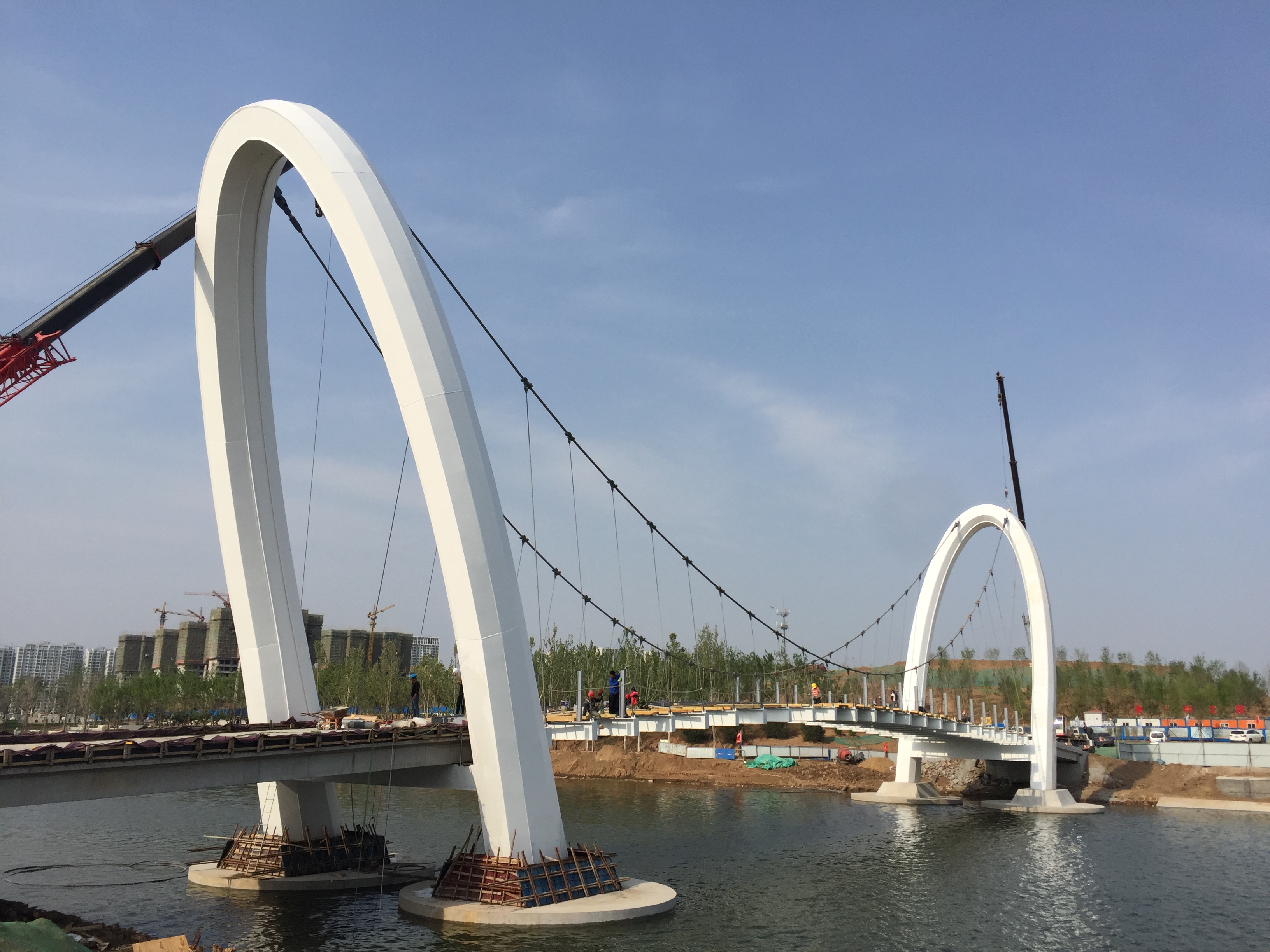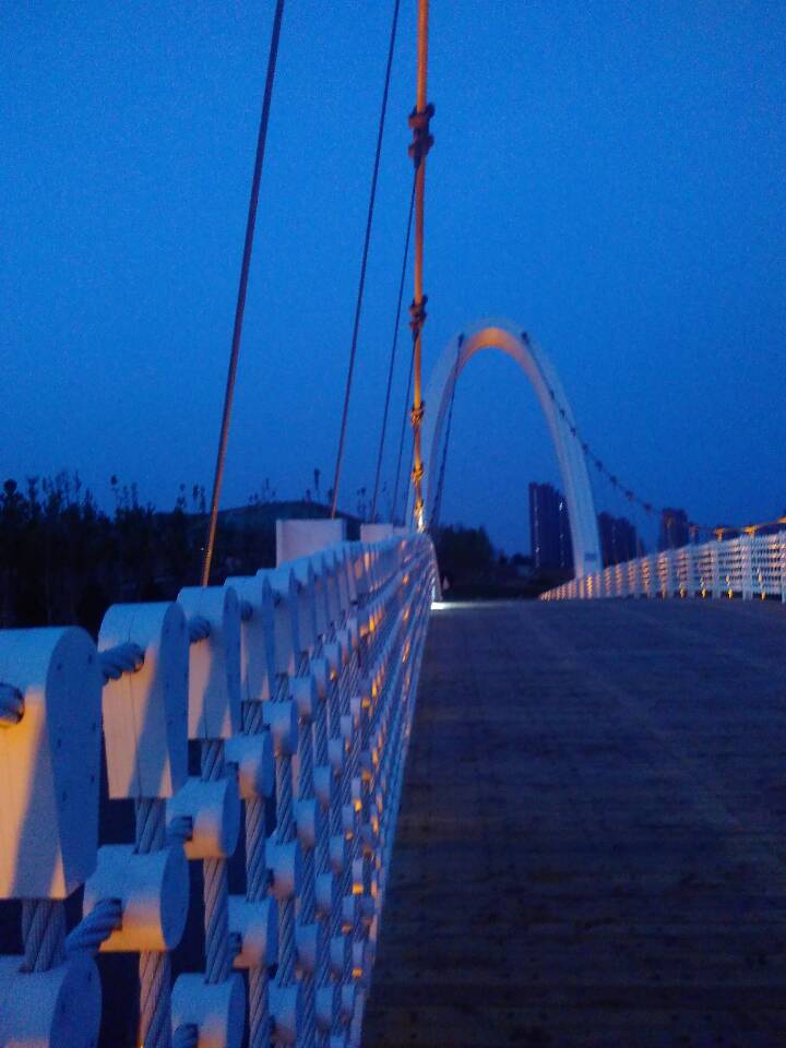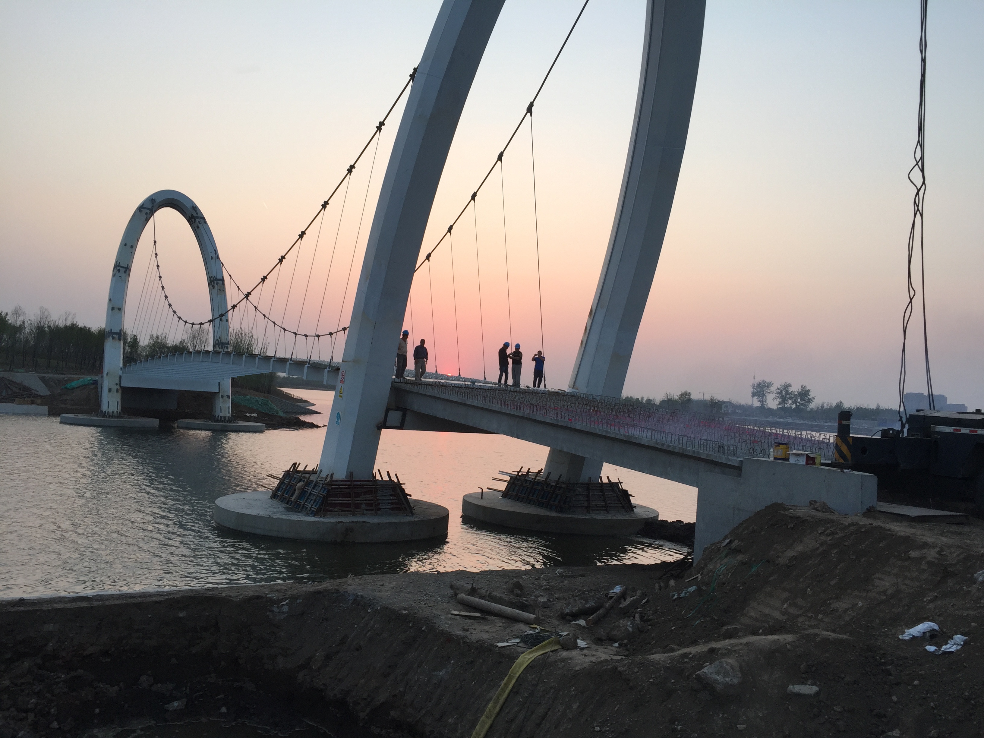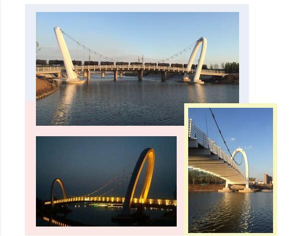 美麗的孝婦河濕地公園內(nèi)矗立著一座雄偉的白色懸索橋,它緊鄰膠濟(jì)鐵路客貨雙線橋,橫跨孝婦河?xùn)|西兩岸,遠(yuǎn)遠(yuǎn)望去猶如一條鋼鐵巨龍?jiān)陉?yáng)光下熠熠生輝。陽(yáng)光下,碧波蕩漾,懸索橋意氣風(fēng)發(fā)盤(pán)踞在水波之中;夜空中,星輝閃耀,懸索橋潔白如玉與銀河相互輝映。這就是由我山東魯中公路建設(shè)有限公司所承建的淄博市第一座鋼結(jié)構(gòu)懸索橋。