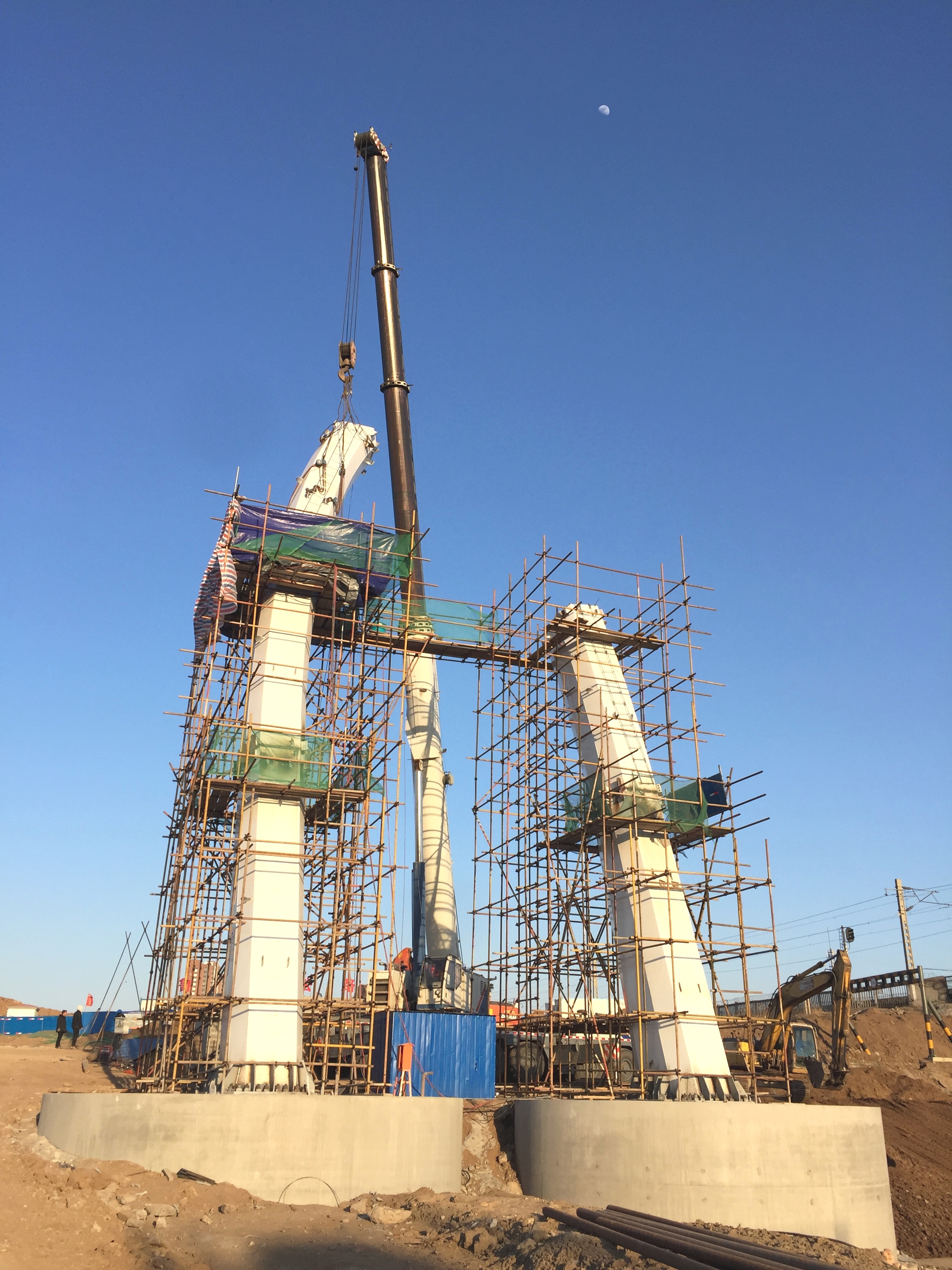 2017年3月14日,鋼主塔安裝現(xiàn)場(chǎng)。