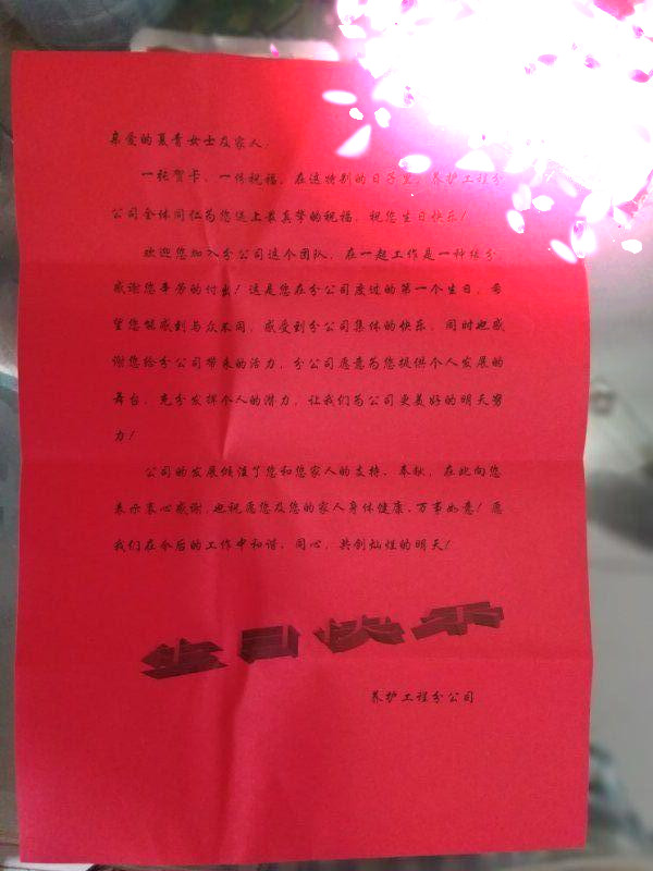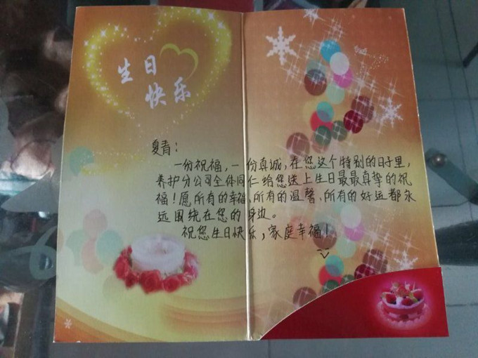 我自參加工作以來(lái)第一次去到公路施工第一線,常駐工地才切身體會(huì)到了身在工地不能按時(shí)回家的辛苦。早在6月份時(shí),養(yǎng)護(hù)分公司辦公室人員就提前詢問(wèn)大家的生日,我們也因此早知道公司要給大伙祝賀生日,可當(dāng)我真正收到賀卡、蛋糕、禮物的時(shí)候,心里還是非常感動(dòng),心情非常激動(dòng),由衷的感謝公司各位領(lǐng)導(dǎo)的關(guān)愛(ài)。