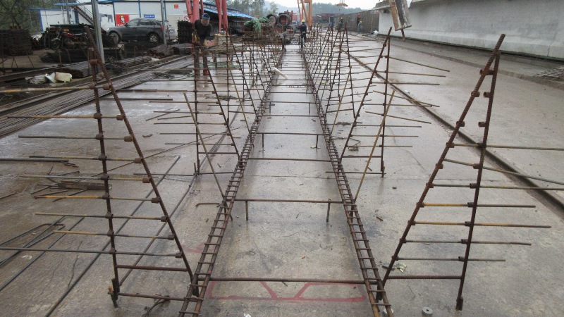 通過查閱圖紙,掌握整片箱梁鋼筋骨架的最外圍輪廓尺寸及每種類型鋼筋的型號(hào)、尺寸、間距、數(shù)量,做到心中有數(shù)。
