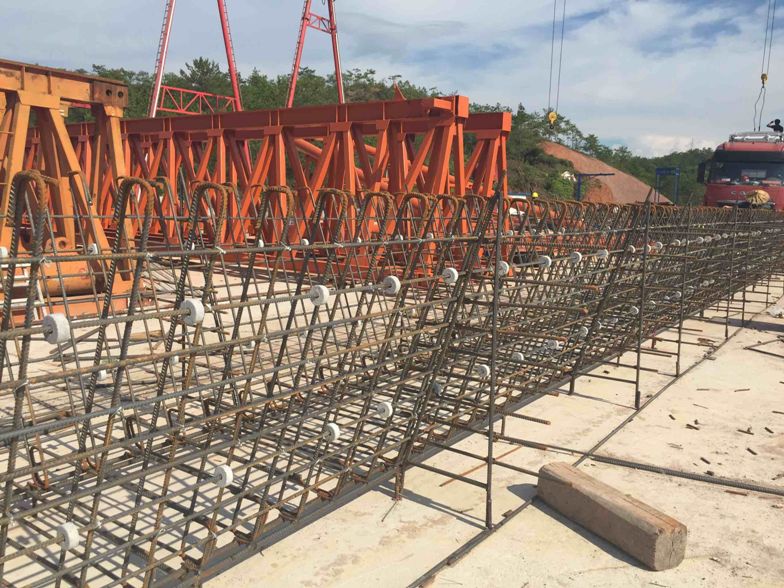 二、使用方法將胎架放置在水平的硬化場地,首先將裁好的腹板外層縱向筋擺放到胎架套筒水平定位筋上,再將加工好的腹板環(huán)形筋和底板環(huán)形筋按刻度一一擺放好并與縱向筋綁扎,然后再穿入底板縱向筋并按刻度綁扎,最后綁扎腹板內(nèi)側(cè)縱向筋。上述工作全部進(jìn)行完畢,經(jīng)監(jiān)管工程師驗(yàn)收后,將胎架兩側(cè)水平定位筋由套筒向外抽出,采用龍門吊即可將骨架吊裝至箱梁底模,接著進(jìn)行下一道工序。