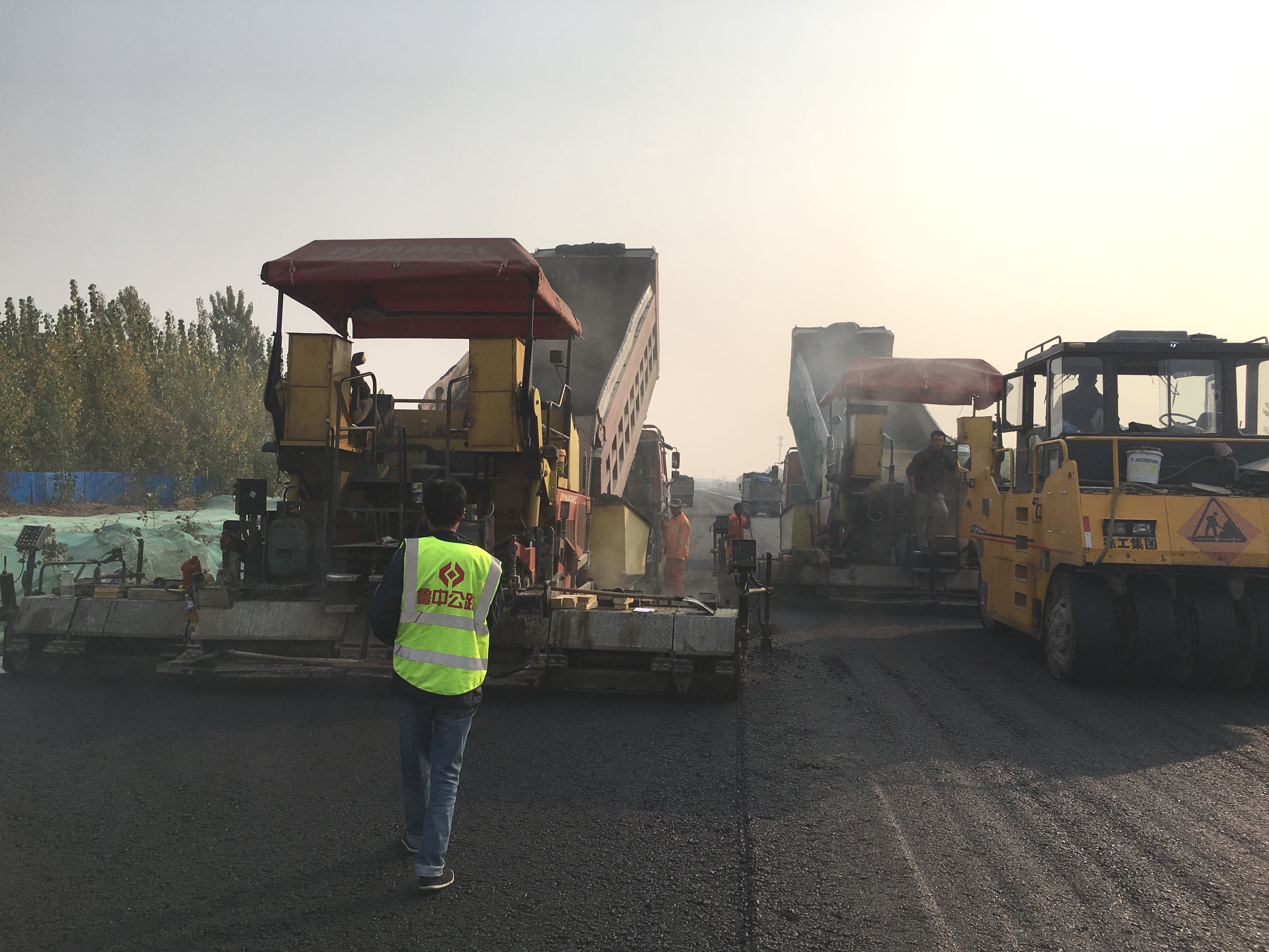 在精心準(zhǔn)備下,11月7日,我部順利完成了200米瀝青下面層試驗段攤鋪工作。此次試驗位于K10+540-K10+740段左幅,施工現(xiàn)場采用2臺攤鋪機半幅連續(xù)攤鋪壓路機跟進壓實的施工工藝,經(jīng)過5個多小時緊張的施工,最終完成了AC-25C下面層試驗段的試鋪。攤鋪過程中,項目部領(lǐng)導(dǎo)及主要管理人員全程堅守在施工現(xiàn)場,從壓路機清潔、溫度控制、攤鋪厚度、壓實度、平整度、現(xiàn)場檢測等各個環(huán)節(jié)嚴格把關(guān),確保試驗過程和結(jié)果符合設(shè)計指標(biāo)、技術(shù)規(guī)范和安全質(zhì)量要求。