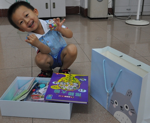 在發(fā)放禮物的過程中,有個三歲的小姑娘一到公司就哭了,因為她始終懷疑媽媽是騙她來打預防針的。當把禮物送到她的懷中后,她打開立體飛機的賀卡,抽抽搭搭的問哥哥:“哥哥,我們坐飛機去找爸爸吧。”哥哥說:“這就是爸爸單位啊。”小姑娘說:“爸爸不在這里,我沒看到爸爸。”媽媽對她說:“爸爸在工地上呢,爸爸正在工作,不說好了過幾天就回來了嗎?”小姑娘說:“我不,我現在就要坐飛機去找爸爸,快走吧!”哥哥牽著梨花帶雨的妹妹:“不哭了,我們先回家,哥哥教你畫真飛機,然后咱們去找爸爸。”