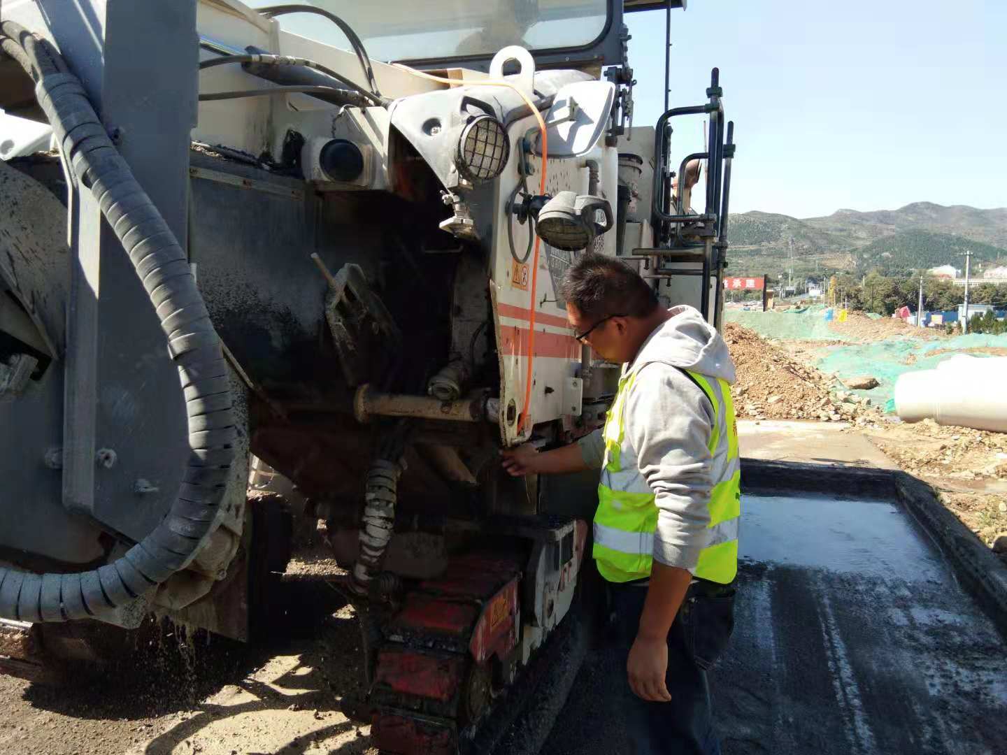 在人民路路面銑刨過程中,侯曉對銑刨機工作時所產(chǎn)生的大量煙塵問題很是關(guān)心。他在工作之余查閱了大量資料,在充分了解了銑刨機工作的原理之后,結(jié)合自己的工作經(jīng)驗,畫出了一個簡易的草圖,設計出了一款噴霧裝置,安裝到銑刨機上。經(jīng)過多次的實驗,效果非常好,大大減少了銑刨機在工作時的揚塵。