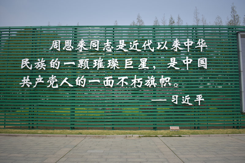 移步換景,主館后是周總理銅像,銅像總高度7.8米,寓意總理走過的78個光輝人生,其姿勢取材于周恩來與農(nóng)民親切交談時的習(xí)慣動作——雙手叉腰、面帶微笑,顯現(xiàn)出周恩來平易近人的風(fēng)范。