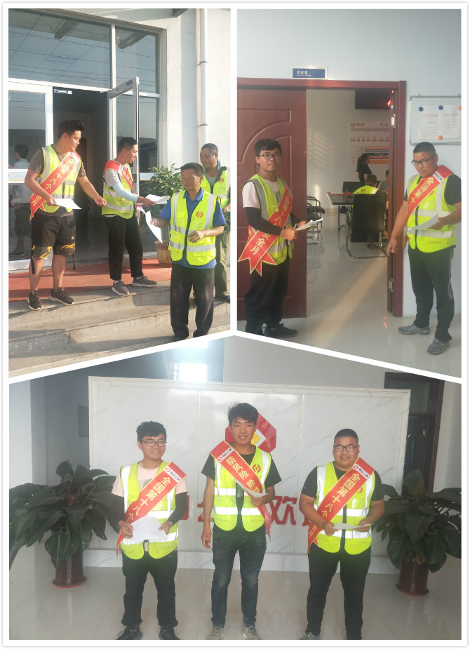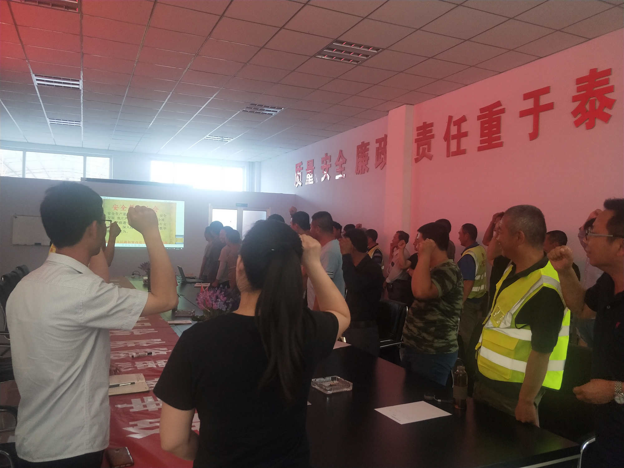 沂源縣人民路拓寬改造項(xiàng)目也不甘落后,于6月1日養(yǎng)護(hù)分公司召開安全月動員大會后,治安科就開始行動起來,印條幅、綬帶、帶領(lǐng)大家觀看警示視頻等,并于6月7日組織全體職工及施工隊負(fù)責(zé)人進(jìn)行了一次“安全誓師大會”。