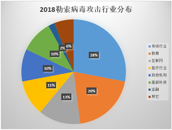 根據(jù)大數(shù)據(jù)統(tǒng)計(jì),勒索病毒在全國(guó)各地均有流竄,尤其以山東、河南、浙江、廣東等地最為嚴(yán)重。作為一款流氓軟件,勒索病毒的下手對(duì)象倒看出了其極大的性格分裂,他一直“偏愛”傳統(tǒng)的端莊的大方的受害對(duì)象。通過2018年勒索病毒攻擊行業(yè)分布可以看出,傳統(tǒng)行業(yè)、教育、互聯(lián)網(wǎng)行業(yè)最為嚴(yán)重,醫(yī)療、政府機(jī)構(gòu)緊隨其后。事關(guān)國(guó)計(jì)民生的各個(gè)行業(yè),一旦社會(huì)長(zhǎng)期依賴的基礎(chǔ)遭受攻擊,將帶來難以估計(jì),且不可逆轉(zhuǎn)的損失。