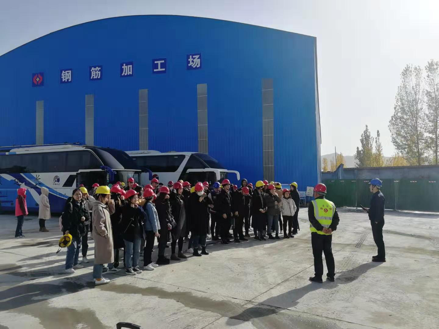 參觀結(jié)束,同學(xué)們依依不舍踏上歸程。臨行與預(yù)制場(chǎng)施工人員合影留念