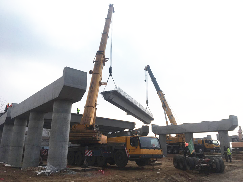 青蘭二標(biāo)設(shè)計(jì)箱梁624片,目前已經(jīng)完成梁板預(yù)制265片,計(jì)劃預(yù)制完成時(shí)間為5月31日,預(yù)計(jì)9月份全部架設(shè)完畢,確保實(shí)現(xiàn)總工期目標(biāo)。受現(xiàn)場(chǎng)高壓線、通信線路等影響,全線根據(jù)實(shí)際情況分別采用汽吊、架橋機(jī)進(jìn)行梁板安裝。大荒裕2#橋全長(zhǎng)179.2m,橋面凈寬31m,上部結(jié)構(gòu)采用(2×25.5+25)m+4×25m預(yù)應(yīng)力混凝土(后張)小箱梁,共計(jì)7孔。全橋共計(jì)25m箱梁50片,25.5m箱梁20片。2#橋段場(chǎng)地開(kāi)闊,平整,采用130t和200t兩臺(tái)汽吊,兩端抬梁架設(shè)。