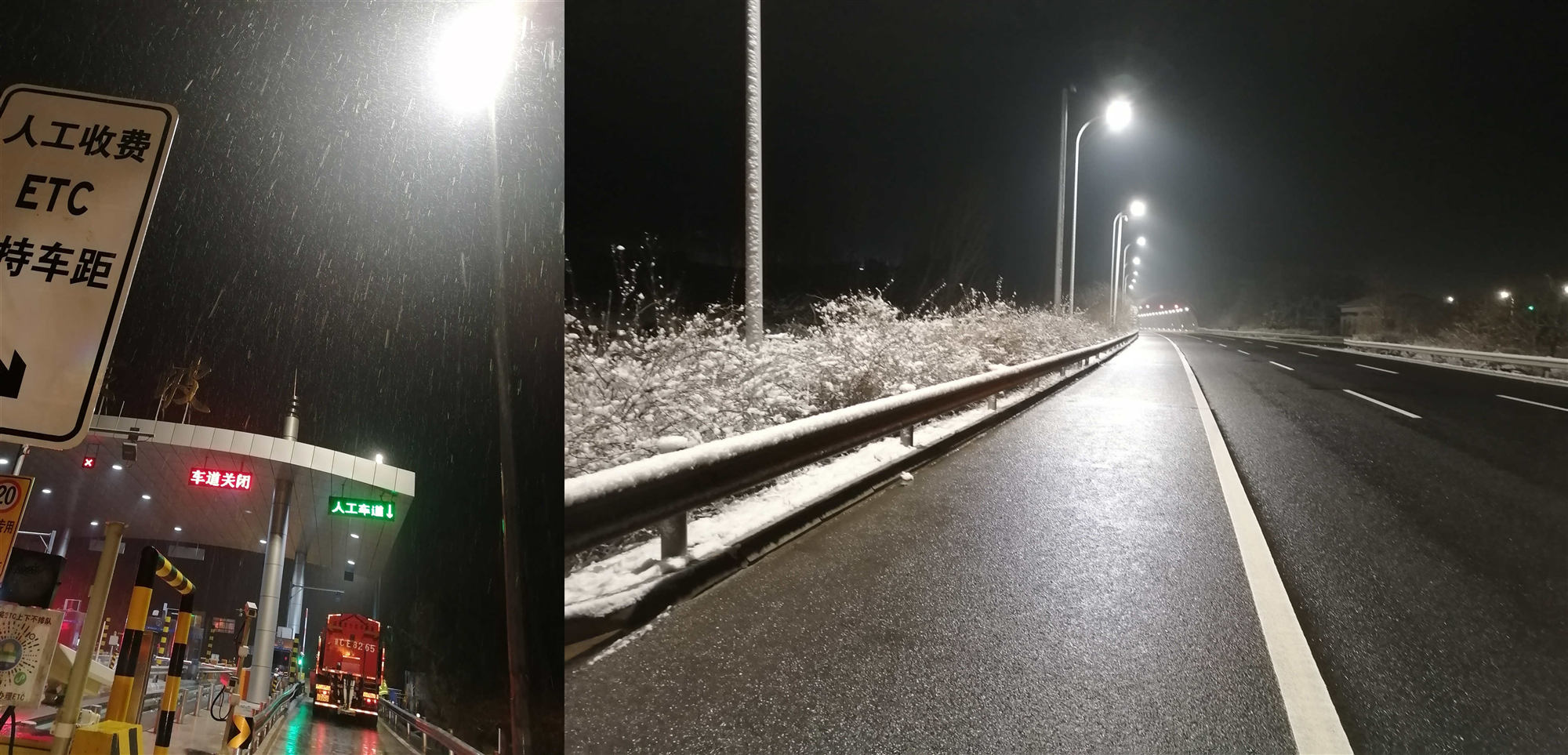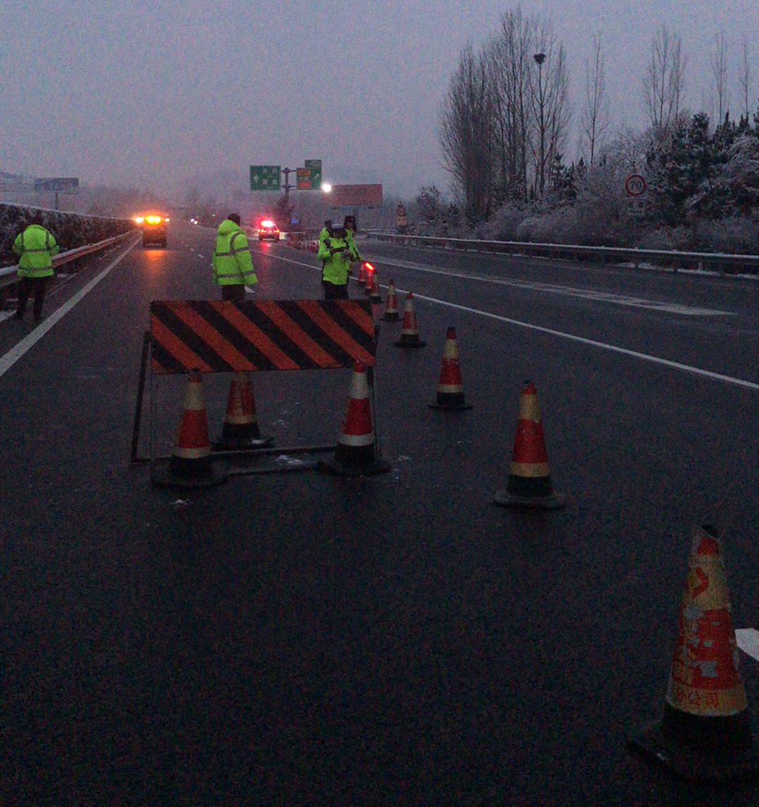 當(dāng)晚21時天空中開始飄起了雪花,21:15時分別在張家坡收費(fèi)站和魯村收費(fèi)站的跟車員黃衍剛、陳仁明接到命令開始按原定計劃撒布融雪劑。23:30分,各自路段融雪劑撒布完成。26日5:50,根據(jù)通知要求,以橋面為主繼續(xù)撒布融雪劑,并擺放安全錐配合高速交警疏導(dǎo)、分流過往車輛。