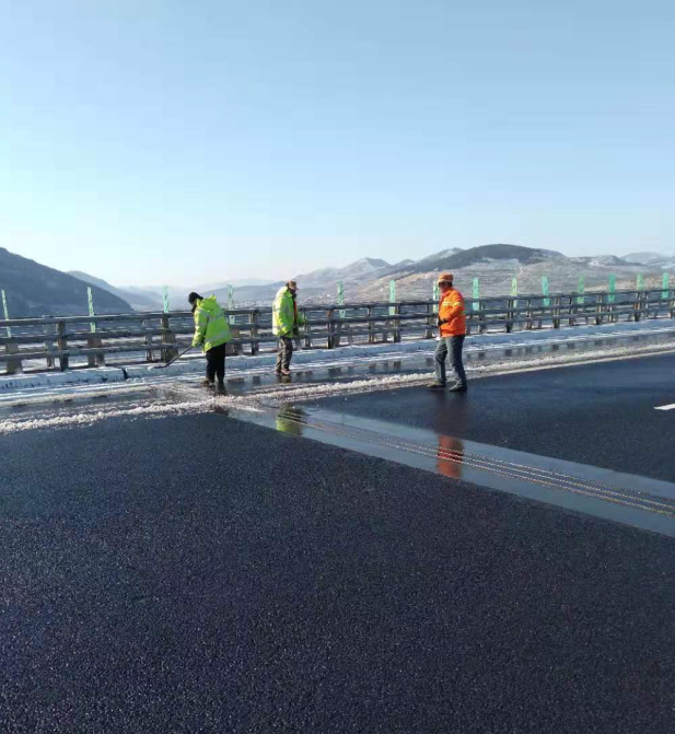 針對今年首個暴雪藍色預警,我項目部高度重視,在接到除雪防滑預警的第一時間部署開展除雪防滑工作,與業(yè)主等養(yǎng)護部門聯(lián)動協(xié)調(diào),及時發(fā)布除雪防滑工作信息。按照業(yè)主除雪防滑技術(shù)指南要求徹夜開展除雪防滑工作,我項目部采取了撒布融雪劑、機械鏟雪、人工清雪等措施,并對橋梁、隧道、陡坡、震蕩標線等重點地段進行重點防控,切實做好除雪防滑工作。