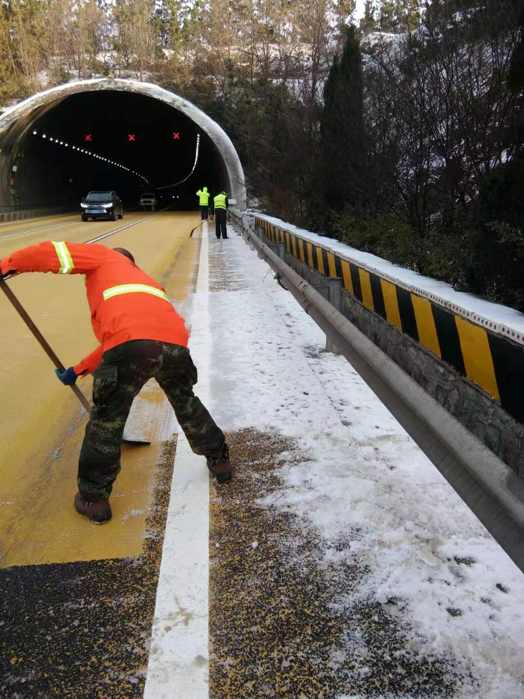 針對(duì)今年首個(gè)暴雪藍(lán)色預(yù)警,我項(xiàng)目部高度重視,在接到除雪防滑預(yù)警的第一時(shí)間部署開展除雪防滑工作,與業(yè)主等養(yǎng)護(hù)部門聯(lián)動(dòng)協(xié)調(diào),及時(shí)發(fā)布除雪防滑工作信息。按照業(yè)主除雪防滑技術(shù)指南要求徹夜開展除雪防滑工作,我項(xiàng)目部采取了撒布融雪劑、機(jī)械鏟雪、人工清雪等措施,并對(duì)橋梁、隧道、陡坡、震蕩標(biāo)線等重點(diǎn)地段進(jìn)行重點(diǎn)防控,切實(shí)做好除雪防滑工作。