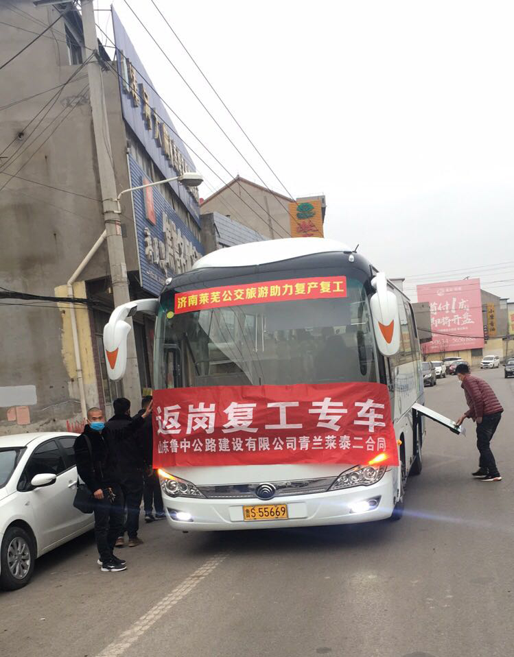 2020年2月27日,青蘭項(xiàng)目部首趟由萊蕪區(qū)發(fā)往河北保定的跨省返崗復(fù)工包車,經(jīng)過12小時(shí)、1000多公里的長途跋涉,順利返回,在青蘭萊泰七個(gè)標(biāo)段中,率先拉開了“點(diǎn)對點(diǎn)”包車返崗復(fù)工的序幕。