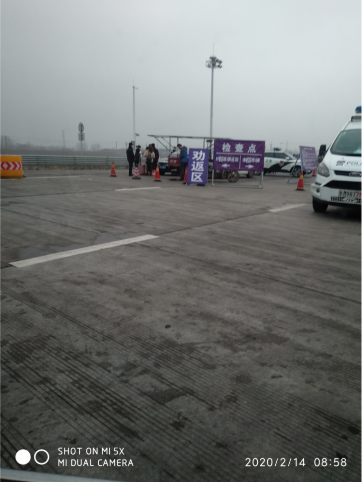 等待了一個(gè)小時(shí)二十分鐘后,看到業(yè)主拿著政府的批準(zhǔn)文件跟防疫人員交涉。此后代理和業(yè)主帶領(lǐng)我們通過收費(fèi)站,進(jìn)入開標(biāo)項(xiàng)目所在地域。圖片中標(biāo)識(shí)牌上寫著外省車輛返回和本省車輛檢查方向指示??磥硗馐≤囕v直接返回,不讓通過。