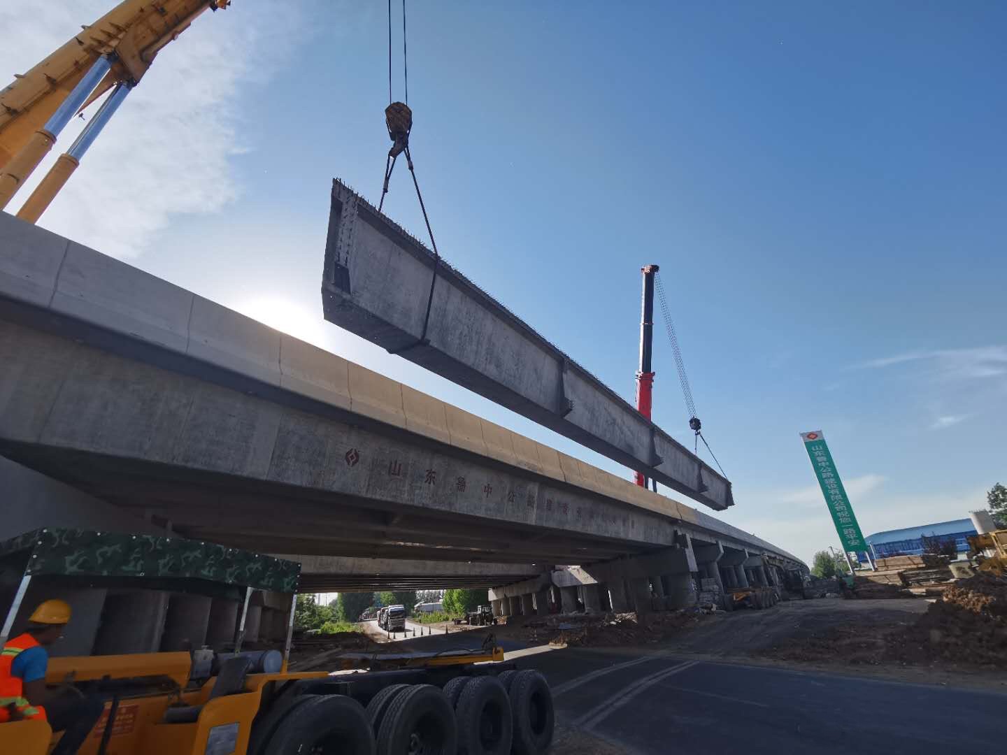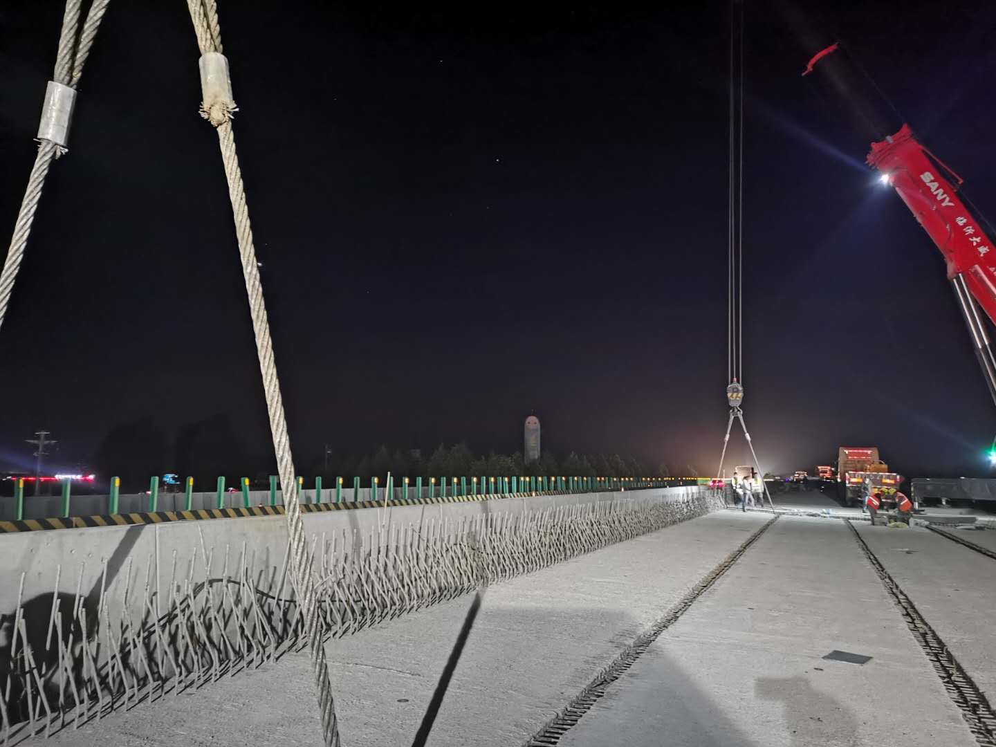 京滬高速公路萊蕪至臨沂段改擴(kuò)建工程第十標(biāo)段,由齊魯交通發(fā)展集團(tuán)投資,山東魯中公路建設(shè)有限公司承建,起訖點(diǎn)樁號(hào)K692+900-K710+000,路線全長17.1km(含紅花埠互通一處、主線收費(fèi)站一處),設(shè)計(jì)速度120km/h,按雙向八車道標(biāo)準(zhǔn)進(jìn)行擴(kuò)建。我部于2020年1月18日率先完成第四階段全幅交通導(dǎo)改,右幅雙向通行,左幅封閉施工,進(jìn)行左幅老橋拆除新建和路面施工。其中K693+964.355歸昌特大橋,全長共1233m,共14聯(lián),是我標(biāo)全線唯一的特大橋,也是全線重點(diǎn)控制工程之一,歸昌特大橋1-3聯(lián)上部結(jié)構(gòu)形式采用現(xiàn)澆普通鋼筋砼空心板、第10、12聯(lián)采用普通鋼筋砼現(xiàn)澆板(拆除新建)、第4-9、13、14聯(lián)采用預(yù)應(yīng)力砼(先張)橋面連續(xù)空心板(20m共435片,22.31m共5片)、第11聯(lián)采用預(yù)應(yīng)力砼(后張)簡(jiǎn)支小箱梁(40m共14片),下部結(jié)構(gòu)采用柱式墩+肋板臺(tái)。預(yù)制箱梁所處位為歸昌特大橋第11聯(lián)拆除新建,上跨G310國道,車流量較大,施工吊裝難度風(fēng)險(xiǎn)大,為確保歸昌特大橋左幅最后5片預(yù)制箱梁順利架設(shè),我部首先進(jìn)行優(yōu)化施工方案、細(xì)化工作計(jì)劃、強(qiáng)化施工組織,成立專門的領(lǐng)導(dǎo)小組,合理進(jìn)行資源配置,然后施工前對(duì)現(xiàn)場(chǎng)施工人員進(jìn)行安全、質(zhì)量技術(shù)交底,讓現(xiàn)場(chǎng)每位施工人員能夠熟悉架梁流程及施工安全注意事項(xiàng),提高安全生產(chǎn)意識(shí),嚴(yán)格按照技術(shù)規(guī)范及要求精細(xì)架設(shè)。5月10日我部開始進(jìn)行箱梁吊裝前一系列準(zhǔn)備工作,本次吊裝采用2輛400t汽車吊雙機(jī)起吊的形式進(jìn)行施工,在箱梁運(yùn)輸和架設(shè)過程中,項(xiàng)目部領(lǐng)導(dǎo)親自在現(xiàn)場(chǎng)指揮,我部克服了天氣及運(yùn)梁線路條件復(fù)雜、上跨G310國道等不利因素,在全體人員的共同努力下,于5月11日晚20:10分將左幅最后5片預(yù)制箱梁全部順利吊裝到位,實(shí)現(xiàn)主線全線貫通。