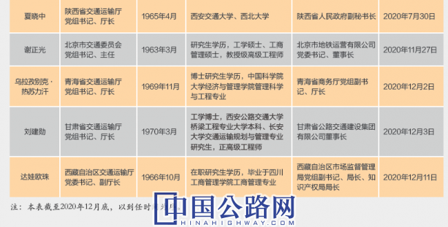 2020年12月內(nèi),全國3位新任交通運輸廳“一把手”到任。12月2日,經(jīng)青海省第十三屆人民代表大會常務(wù)委員會第二十二次會議通過,任命烏拉孜別克·熱蘇力汗為交通運輸廳廳長。在緊接著的12月3日,青海的鄰省甘肅也決定了任命劉建勛為交通運輸廳廳長。12月11日,西藏自治區(qū)政府、區(qū)黨委組織部宣布,決定任命達娃歐珠同志為西藏自治區(qū)交通運輸廳黨委書記、副廳長。