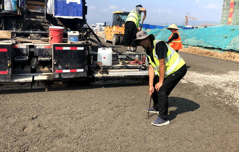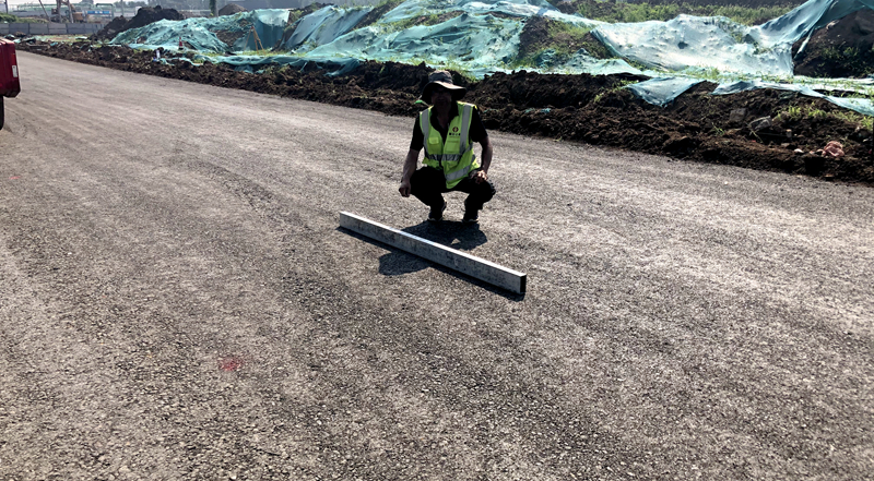 攤鋪過程中,現(xiàn)場質(zhì)檢人員隨時檢查松鋪厚度,以保證結(jié)構(gòu)層厚度;碾壓階段,采取“先邊后中”、“先輕后重”的施工原則,并及時檢測水穩(wěn)混合料的含水量及水泥劑量;碾壓完成后,由項目現(xiàn)場質(zhì)檢人員對高程、橫坡、寬度、平整度及壓實度進行檢測,嚴格控制施工質(zhì)量。
