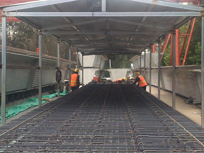 按照圖紙設(shè)計,該鋼筋縱向間距50cm,橫向隨頂板橫筋布置,每根橫筋布置5根。初期施工時,加工了頂板筋臺架,頂板筋在臺架上全部綁扎完成,工人在成型的鋼筋頂部利用兩側(cè)臺架搭設(shè)工作平臺,蹲在平臺上后退著逐個焊接拉結(jié)筋??v向通過拉線,橫向通過尺量定位,功效慢,干擾多,勞動強度大,定位不準(zhǔn)確,線形不順直,外觀質(zhì)量較差。