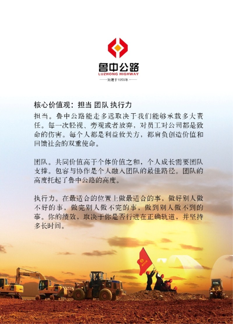 未來的路還很遠(yuǎn),但我們的信念不變,員工的努力,妻子的支持,孩子的爭氣成就了我們的底氣。我們心中都有一個(gè)夢(mèng),一個(gè)溫暖的,逐漸在清晰走來的夢(mèng)??释谖覀冞@一代人手中,通過努力打造一個(gè)受人尊重的,充滿生機(jī)與活力的魯中公路。