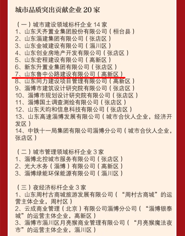 2022年2月7日,淄博市召開全市品質(zhì)提升年動員大會,淄博市委副書記、市長馬曉磊主持會議。會議通報了2021年我市支持企業(yè)發(fā)展的各項政策落實情況,宣讀了淄博市委、市政府關(guān)于表彰“落實突破年”和鄉(xiāng)村振興工作先進(jìn)集體和先進(jìn)個人的決定。會上,還為新經(jīng)濟(jì)引領(lǐng)、產(chǎn)業(yè)強市、科技創(chuàng)新、金融賦能突出貢獻(xiàn)企業(yè)代表,為外貿(mào)投資、生態(tài)文明、文旅繁榮、城市品質(zhì)、社會責(zé)任九大領(lǐng)域選樹的200家突出貢獻(xiàn)企業(yè)(單位)代表頒獎。其中,山東魯中公路建設(shè)有限公司榮獲城市品質(zhì)突出貢獻(xiàn)企業(yè)榮譽。
