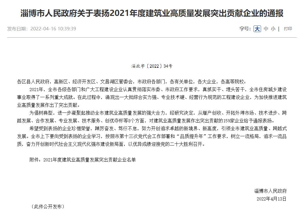 近日,淄博市人民政府發(fā)布《關(guān)于表揚2021年度建筑業(yè)高質(zhì)量發(fā)展突出貢獻企業(yè)的通報》,從增產(chǎn)創(chuàng)收、開拓外埠市場、技術(shù)進步、跨越發(fā)展、合作發(fā)展、專業(yè)發(fā)展、技術(shù)服務(wù)、創(chuàng)優(yōu)奪杯八個方面,對建筑業(yè)高質(zhì)量發(fā)展作出突出貢獻的企業(yè)給予通報表揚。我公司榮獲增產(chǎn)創(chuàng)收突出貢獻企業(yè)獎。