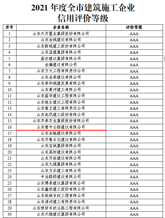 4月29日,淄博市住房和城鄉(xiāng)建設(shè)局發(fā)布《關(guān)于2021年度淄博市房地產(chǎn)開發(fā)企業(yè)、建筑施工企業(yè)、招標代理機構(gòu)、項目經(jīng)理信用評價等級結(jié)果的通報》,我公司被評為AAA級信用企業(yè)。全市共1131家建筑施工企業(yè)參評,AAA級60家、AA級121家、A級844家、B級99家、C級7家。自2019年至今,公司連續(xù)被評為淄博市建筑施工AAA級信用企業(yè),被列為淄博市建筑市場責任主體信用“紅名單”。