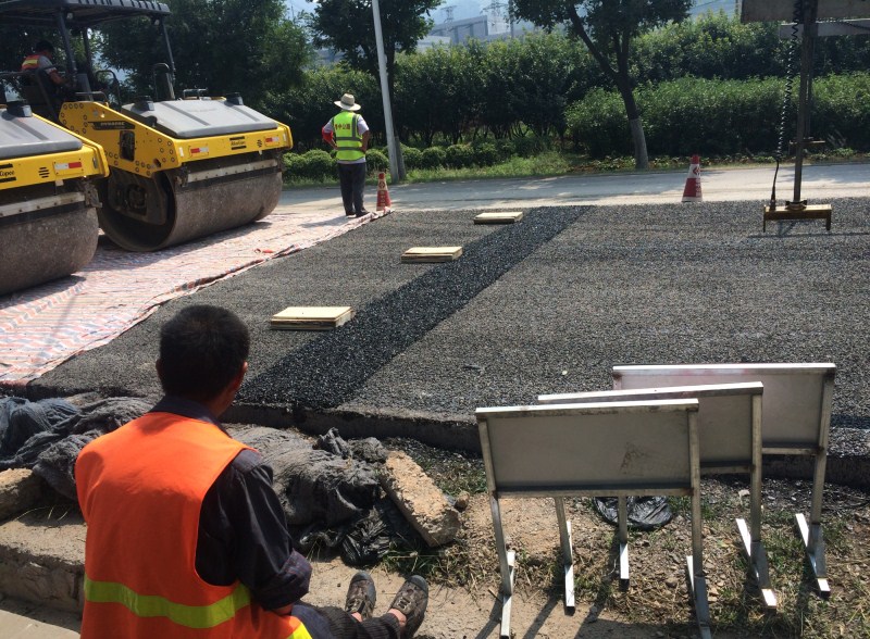 壓路機(jī)準(zhǔn)備就位,接頭處鋪筑石屑以利于接頭。