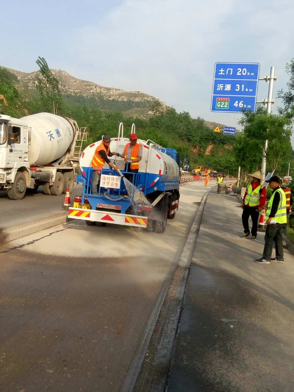 用裝料編織袋壓蓋雙層養(yǎng)生毯,灑水車側(cè)面噴灑養(yǎng)生。